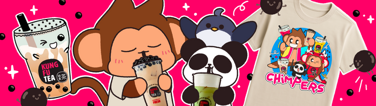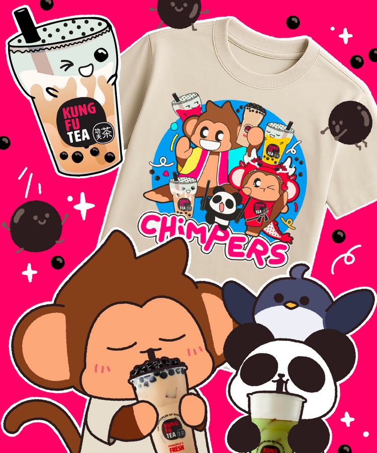 This exclusive tee celebrates the sweet magic of boba bliss, blending the worlds of Chimpers and Kung Fu Tea in one bold, bubbly design.Featuring a vibrant front graphic of Chimpi & Frens living their best boba life, it’s the perfect pick for your next boba date!